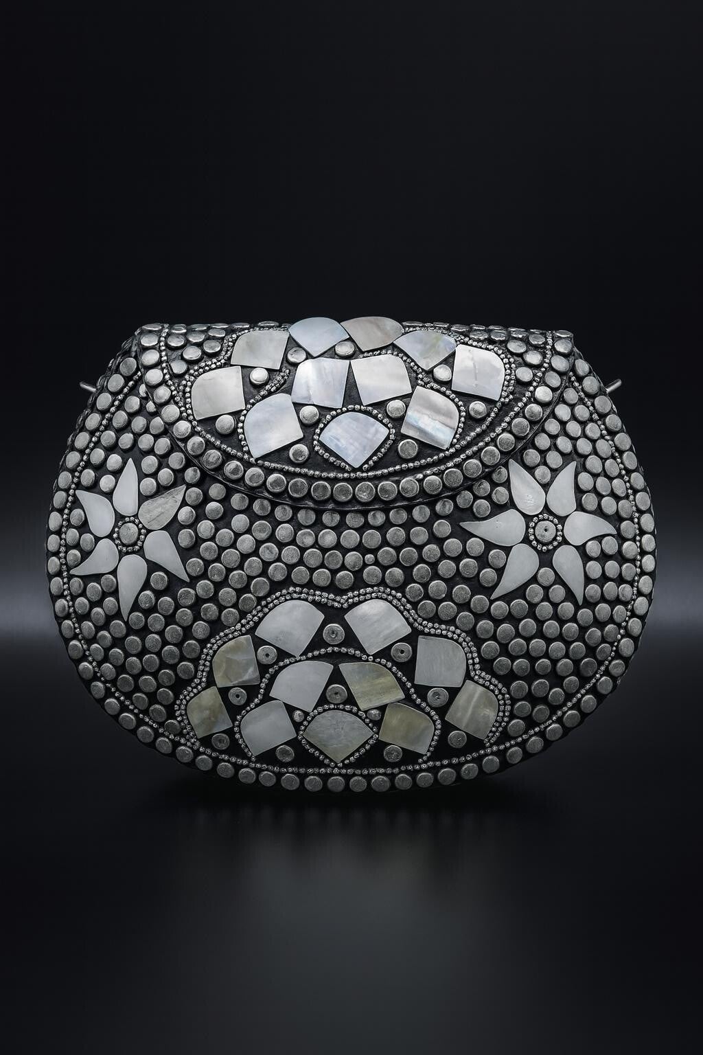 Elevate your look with this handcrafted mosaic evening bag, designed to blend timeless elegance with artisan craftsmanship. Featuring a polished silver brass base, Mother of Pearl shell inlays, and black geometric detailing, this clutch captures the perfect balance of sophistication and bohemian charm. Its monochrome palette of black, white, and silver complements any outfit—whether you’re dressing up for a cocktail party, wedding, or an evening out.