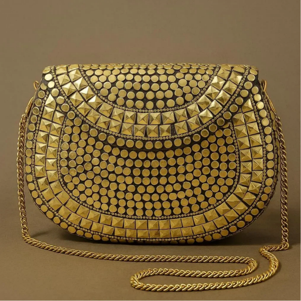 Handmade Gold Mosaic Clutch • Brass Evening Bag • Halfmoon Boho Purse • Artisan Brass Crossbody • Festival Mosaic Handbag • Luxury Gold Studded Clutch • Bohemian Wedding Purse • Indian Handmade Metal Bag • Ethnic Brass Mosaic Art Bag